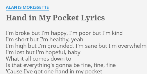 Hand in my pocket album: Я сломал , но я счастлив я беден , но я отчасти я коротко, но я здоров , да. One hand in my pocket and the other one is giving a high five. I feel drunk but i'm sober, i'm young and i'm underpaid i'm tired but i'm working, yeah i care and what it all boils down to is that no one's really got it figured out just yet i've got one hand in my pocket and the other one is playing the piano. What it all comes down to my friends, yeah is that everything's just fine fine fine 'cause i've got one hand in my pocket and the other one is hailing a taxi cab. Is that i haven't got it all figured out just yet 'cause i've got one hand in my pocket and the other one is giving the peace sign i'm free but i'm focused. One hand in my pocket and the other one is giving a high five. Is that i haven't got it all figured out just yet. Xavier flament (flament@onera.fr) lyrics from jeff smith. Ml > исполнители > alanis morissette > тексты и переводы > hand in my pocket. I feel drunk but i'm sober, i'm young and i'm underpaid i'm tired but i'm working. And what it all comes down to. And what it all comes down to is that everything's gonna be quite alright cause i've got one hand in my pocket and the other one is flicking a cigarette.
